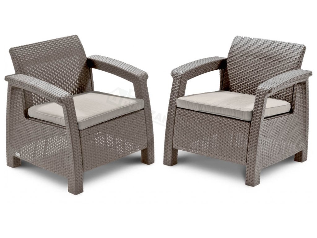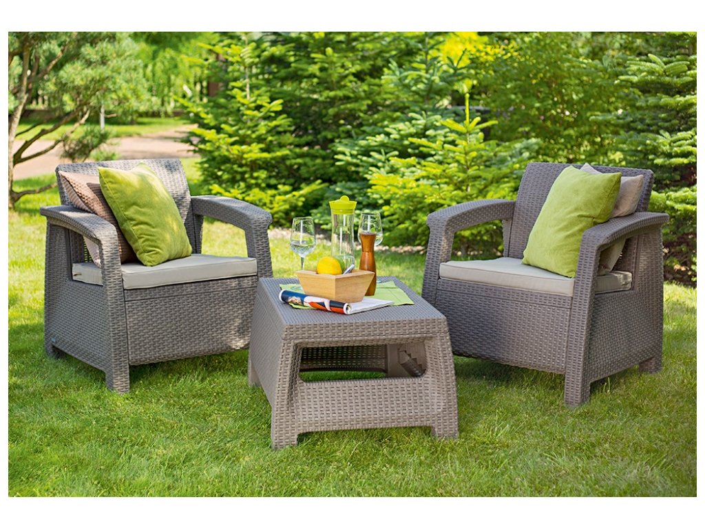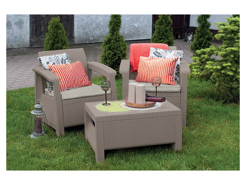 Záhradný set Corfu Weekend tvoria 2 pohodlné kreslá a stolík. Komplet z vysoko kvalitného plastu v imitácii prírodného ratanu vo farbe cappuccino. Kreslá sú doplnené o polstrované sedáky pre väčší komfort. Zostava je pre svoje rozmery vhodná na balkóny, menšie terasy a záhrady.