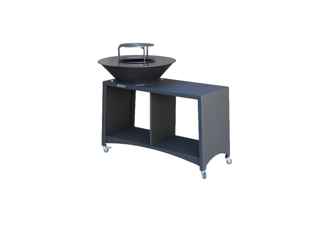 Velké zahradní ohniště s podstavcem vyrobeným z pevné oceli ošetřené žáruvzdorným povrchem. Ohniště je doplněno bočním odkládacím prostorem a rozšířeným úložným prostorem na dřevo.