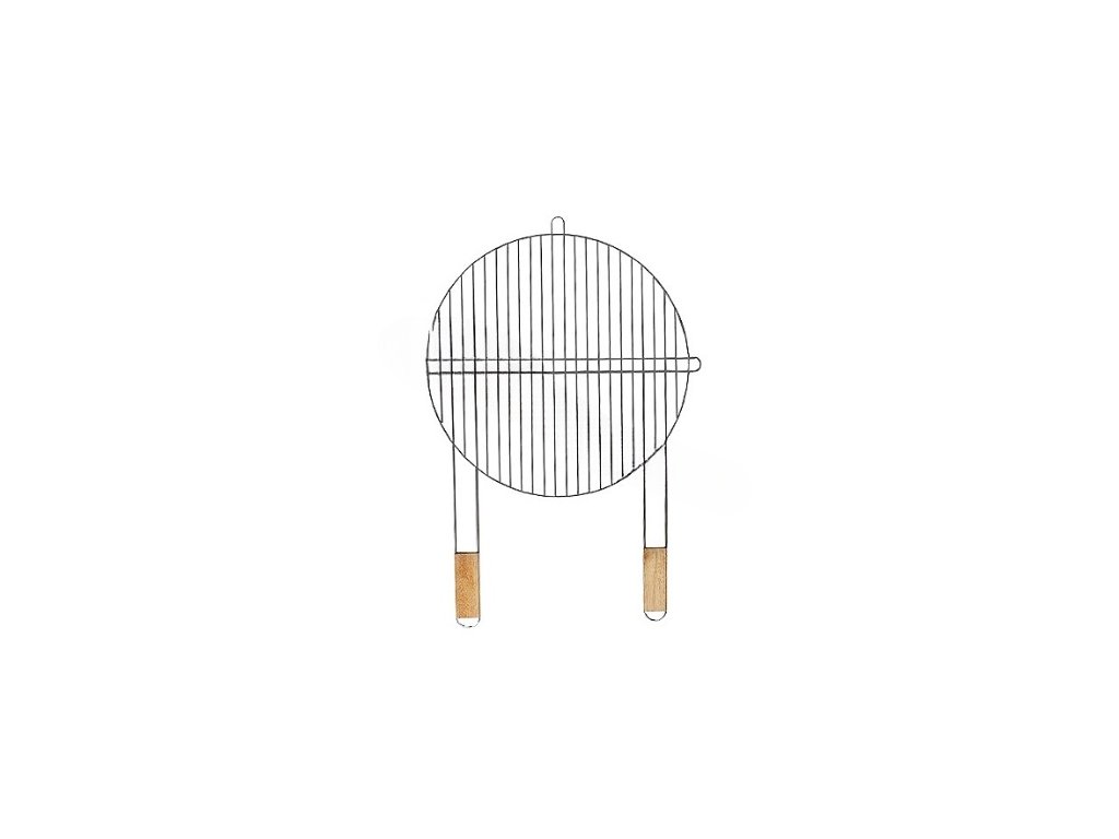 Veľký kvalitný grilovací rošt z chrómovanej ocele. Rozmerný kruhový rošt s madlami opatrenými drevenou rukoväťou pre pohodlnú a bezpečnú manipuláciu.
