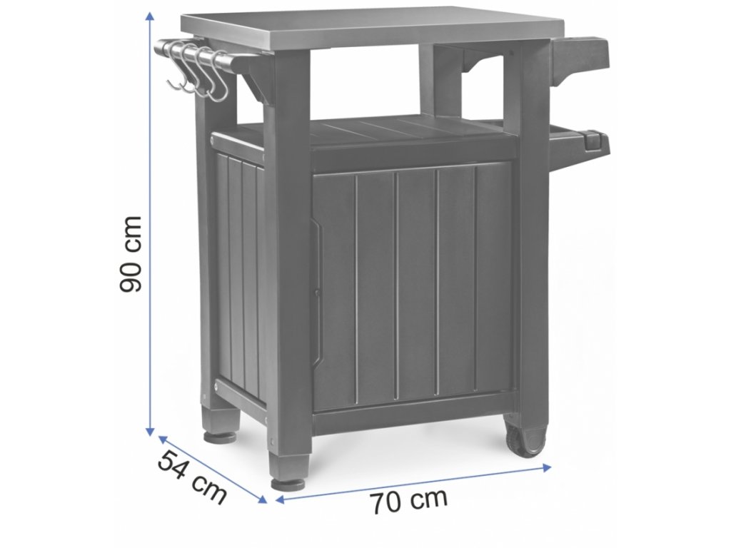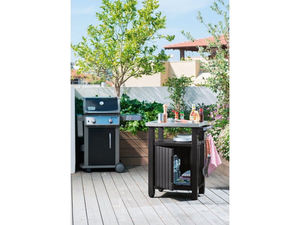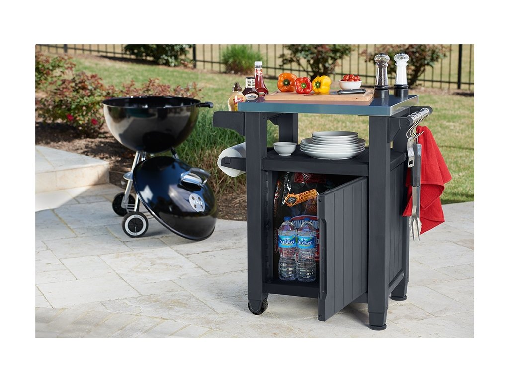 Funkčné a dômyselné riešenie v krásnom štýle ako je multifunkčná skrinka a stolík UNITY 93 L Graphite, bude ideálny pomocník na akejkoľvek záhrade alebo domácej terase. Hlavnou výhodou je jej flexibilné využitie. Premyslený dizajn ju umožňuje použiť ako stôl na prípravu pokrmov a zároveň ako skrinku na skladovanie rôznych druhov produktov a prísad. Unity Storage je vybavená vrchnou časťou z nerezovej ocele, praktickou rukoväťou s ďalšími závesami a kolesami, vďaka čomu je veľmi ľahké ju premiestňovať na rôzne miesta. Priestorná skriňa pojme užitočné príslušenstvo potrebné na prípravu a podávánie jedla pod šírym nebom.