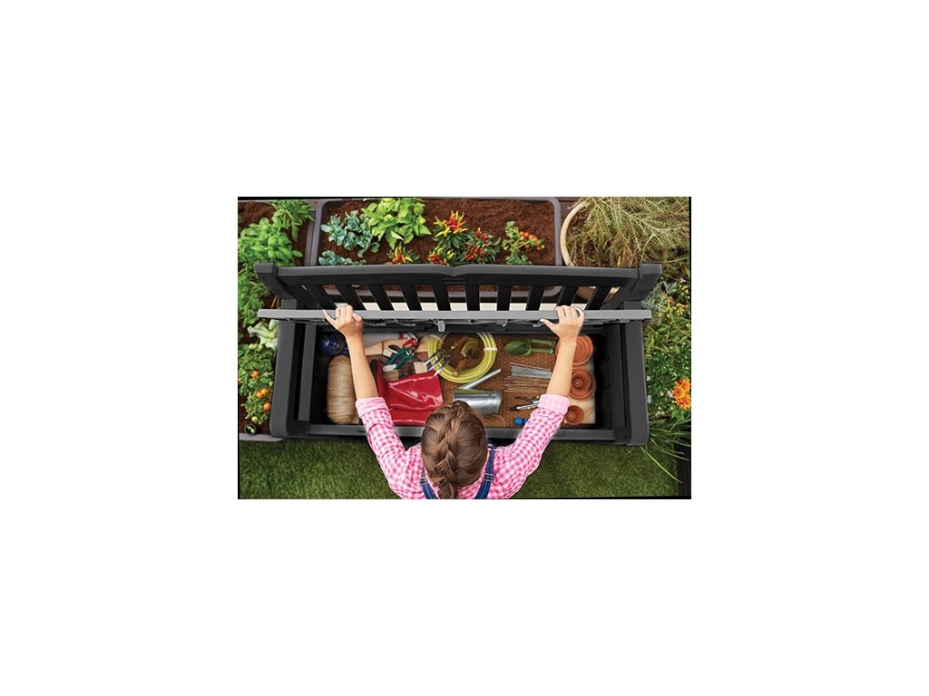Záhradná lavička disponuje priestorom s objemom 265 litrov, ktorý nájde svoje uplatnenie pri uložení podsedákov, záhradného náradia alebo hračiek. Lavica môže byť vybavená visiacim zámkom, ktorý zároveň zaistí bezpečnosť uloženého obsahu.