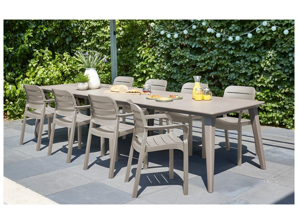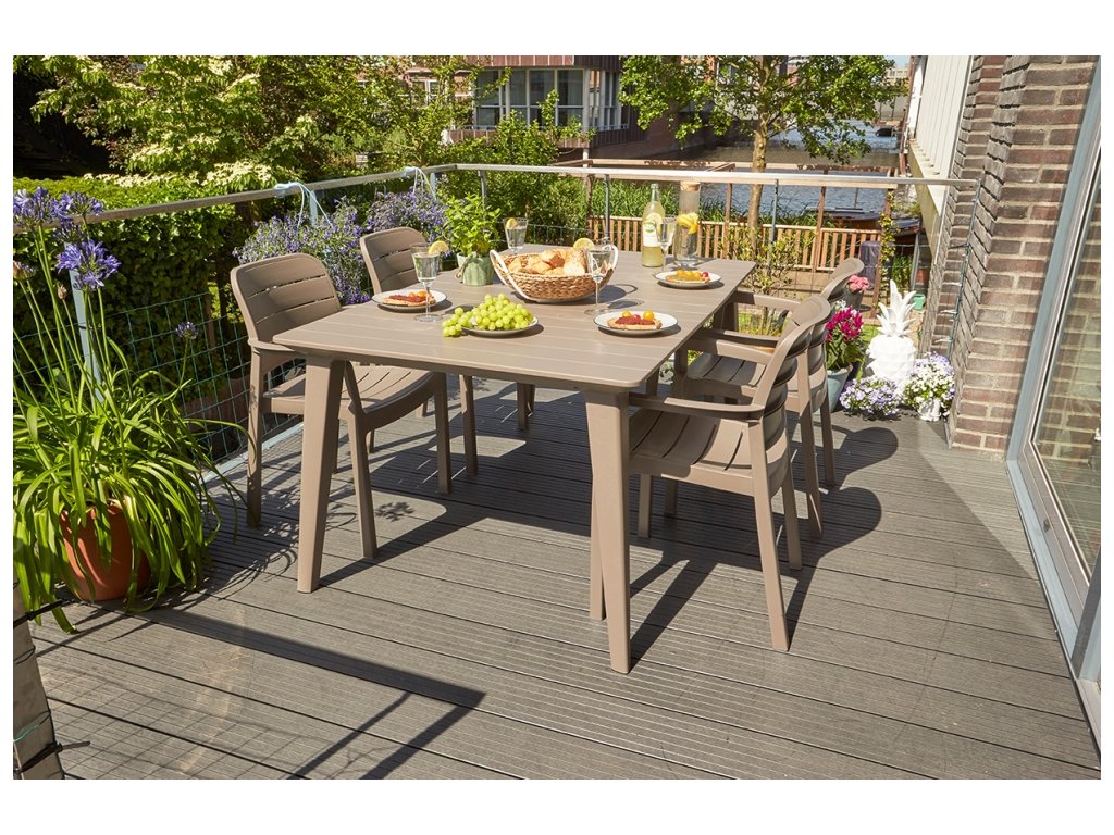 Záhradná stolička Tisara vo farbe cappuccino, vyrobená z pevného plastu odolného voči vplyvom nepriaznivého počasia, ktorý si udrží svoj vzhľad i tvar po dlhú dobu používania vonku. Ergonomicky tvarovaná stolička imituje na opierke a sedáku drevo. Tento vzhľad prírodného materiálu skvele doplní každú terasu, záhradu alebo pergolu. Tvorí skvelú kombináciu so stolmi Melody a Lima.