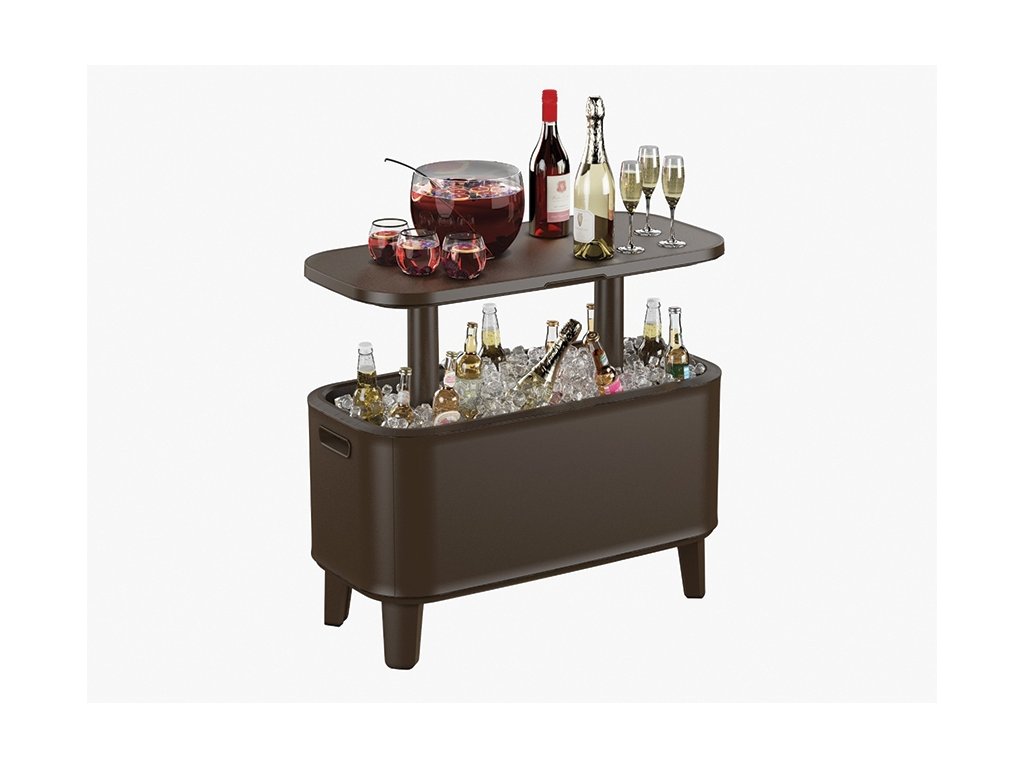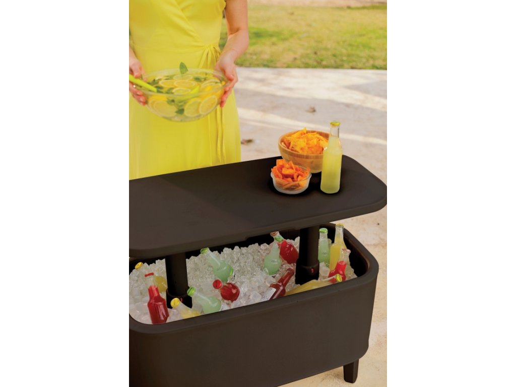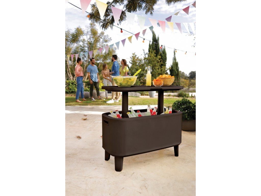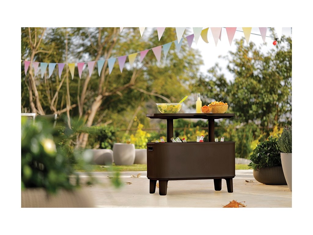 Chladiaci a barový stôl v jednom - Keter Breeze Bar je originálny kúsok, ktorý poteší nielen vás, ale aj vašich hostí. Bar Breeze je ideálny na víkendové stretnutia alebo rodinné oslavy a má veľkú otvorenú priehradku na ľad, ktorá udrží vaše nápoje chladné a vždy na dosah. Výsuvný stolík siaha až 27 cm nad okraj a slúži ako odkladací priestor na chladené nápoje a iné občerstvenie. Pojme až 130 plechoviek alebo 65 fliaš.
