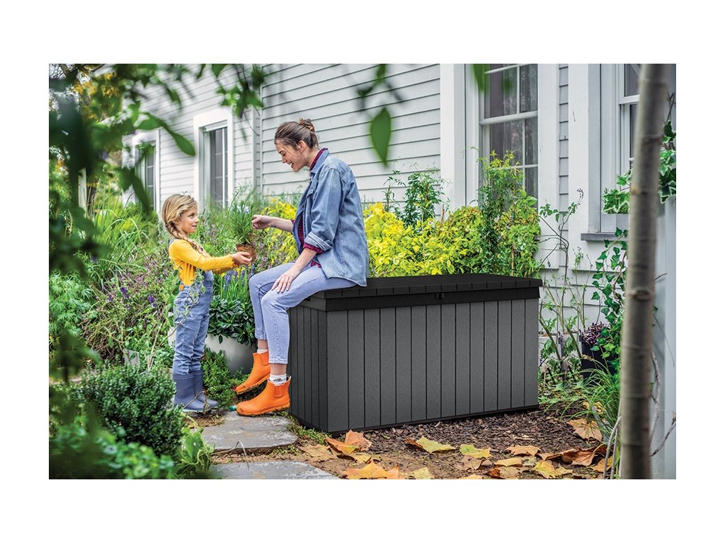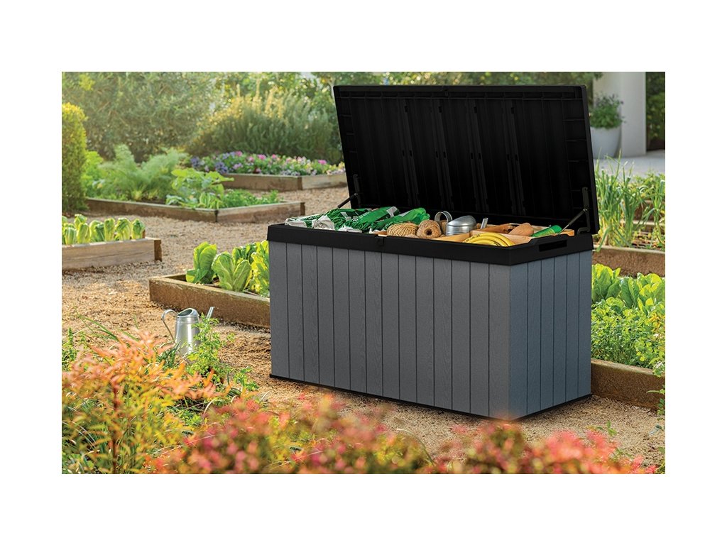 Záhradný box Darwin kombinuje veľmi odolnú konštrukciu s elegantným dizajnom. Je vyrobený z inovatívneho materiálu EVOTECH™, ktorý je odolný voči poveternostným vplyvom a UV žiareniu. Rustikálna štruktúra pripomínajúca drevo a štýlová dvojfarebná kombinácia sú ďalšími estetickými prednosťami výrobku. Vďaka veľkej kapacite sa do boxu Darwin zmestia vankúše a ďalšie príslušenstvo, ktoré vám pomôže udržať poriadok na terase alebo v záhrade. Mechanizmus, vďaka ktorému sa ľahko otvára, je nespornou výhodou tohto výrobku. Uzamykateľné veko vám umožní mať box v prípade potreby pevne uzavretý. Vďaka pevnej konštrukcii možno box používať aj ako sedenie pre dve osoby. Vhodný ako doplnok k domčekom Darwin.