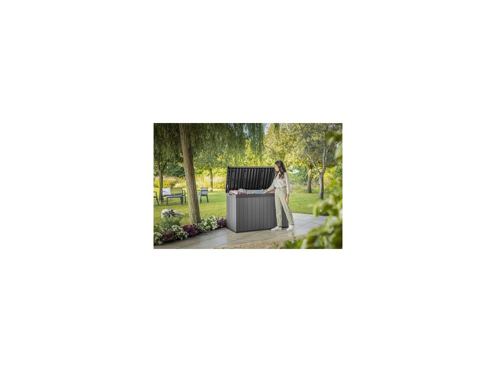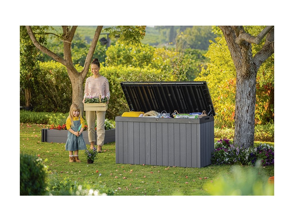 Záhradný box Darwin kombinuje veľmi odolnú konštrukciu s elegantným dizajnom. Je vyrobený z inovatívneho materiálu EVOTECH™, ktorý je odolný voči poveternostným vplyvom a UV žiareniu. Rustikálna štruktúra pripomínajúca drevo a štýlová dvojfarebná kombinácia sú ďalšími estetickými prednosťami výrobku. Vďaka veľkej kapacite sa do boxu Darwin zmestia vankúše a ďalšie príslušenstvo, ktoré vám pomôže udržať poriadok na terase alebo v záhrade. Mechanizmus, vďaka ktorému sa ľahko otvára, je nespornou výhodou tohto výrobku. Uzamykateľné veko vám umožní mať box v prípade potreby pevne uzavretý. Vďaka pevnej konštrukcii možno box používať aj ako sedenie pre dve osoby. Vhodný ako doplnok k domčekom Darwin.