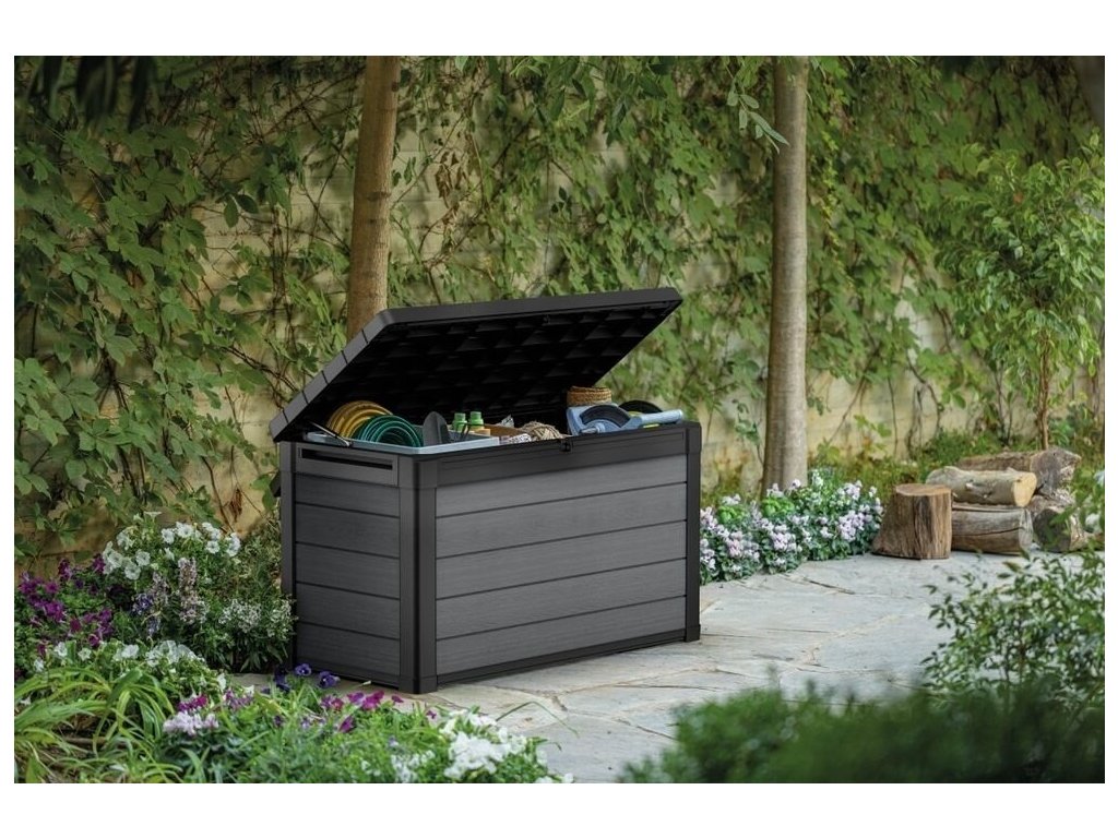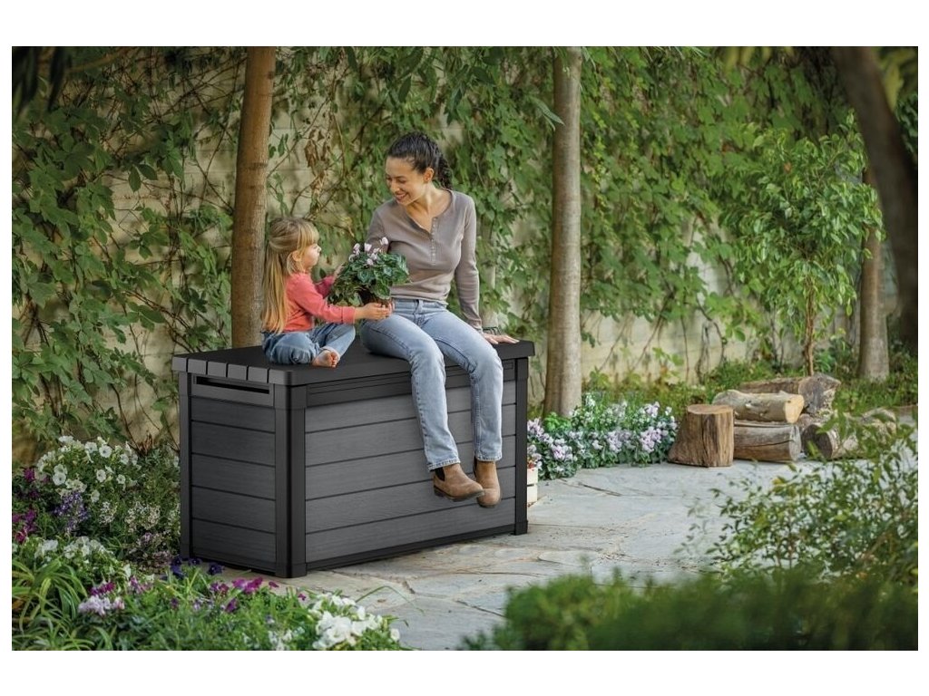 Záhradný úložný box Cortina poskytuje úložný priestor s objemom 380 l, ideálny na uskladnenie objemných vankúšov, záhradných doplnkov alebo športového vybavenia. Vďaka kvalitnému kompozitnému materiálu EVOTECH pripomína vzhľadom aj na dotyk drevo, avšak ponúka vyššiu odolnosť a dlhú životnosť. Pevné veko umožňuje sedenie až dvoch osôb, a jeho ľahké otváranie zaisťujú hydraulické piesty. Box je uzamykateľný, odolný voči poveternostným podmienkam a UV žiareniu a jeho montáž je veľmi jednoduchá. Zámok nie je súčasťou balenia