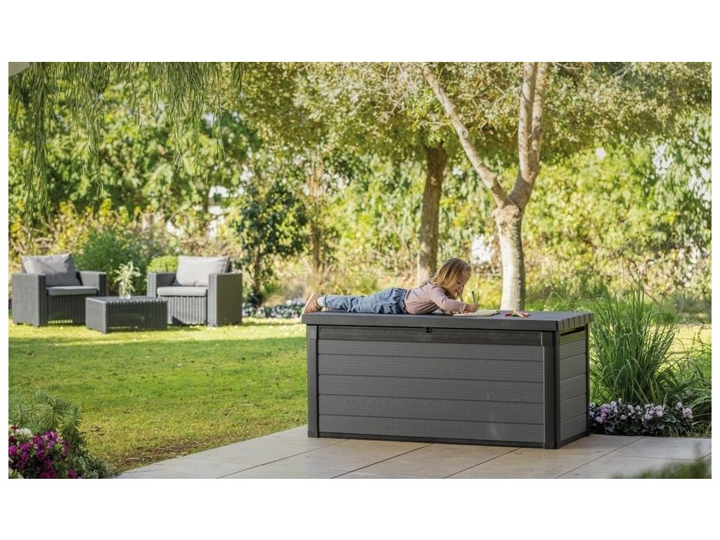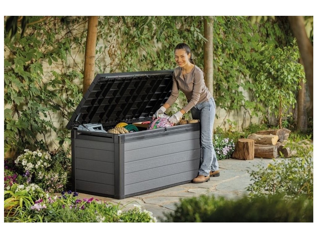 Záhradný úložný box Cortina poskytuje úložný priestor s objemom 570 l, ideálny na uskladnenie objemných vankúšov, záhradných doplnkov alebo športového vybavenia. Vďaka kvalitnému kompozitnému materiálu EVOTECH pripomína vzhľadom aj na dotyk drevo, avšak ponúka vyššiu odolnosť a dlhú životnosť. Pevné veko umožňuje sedenie až dvoch osôb, a jeho ľahké otváranie zaisťujú hydraulické piesty. Box je uzamykateľný, odolný voči poveternostným podmienkam a UV žiareniu a jeho montáž je veľmi jednoduchá. Zámok nie je súčasťou balenia