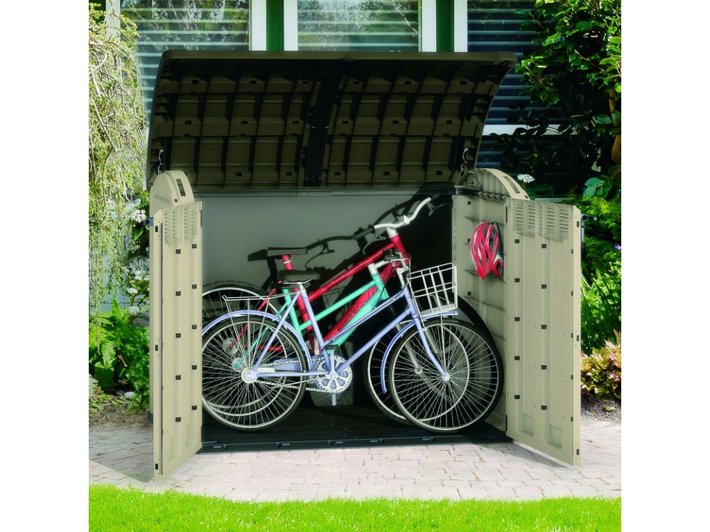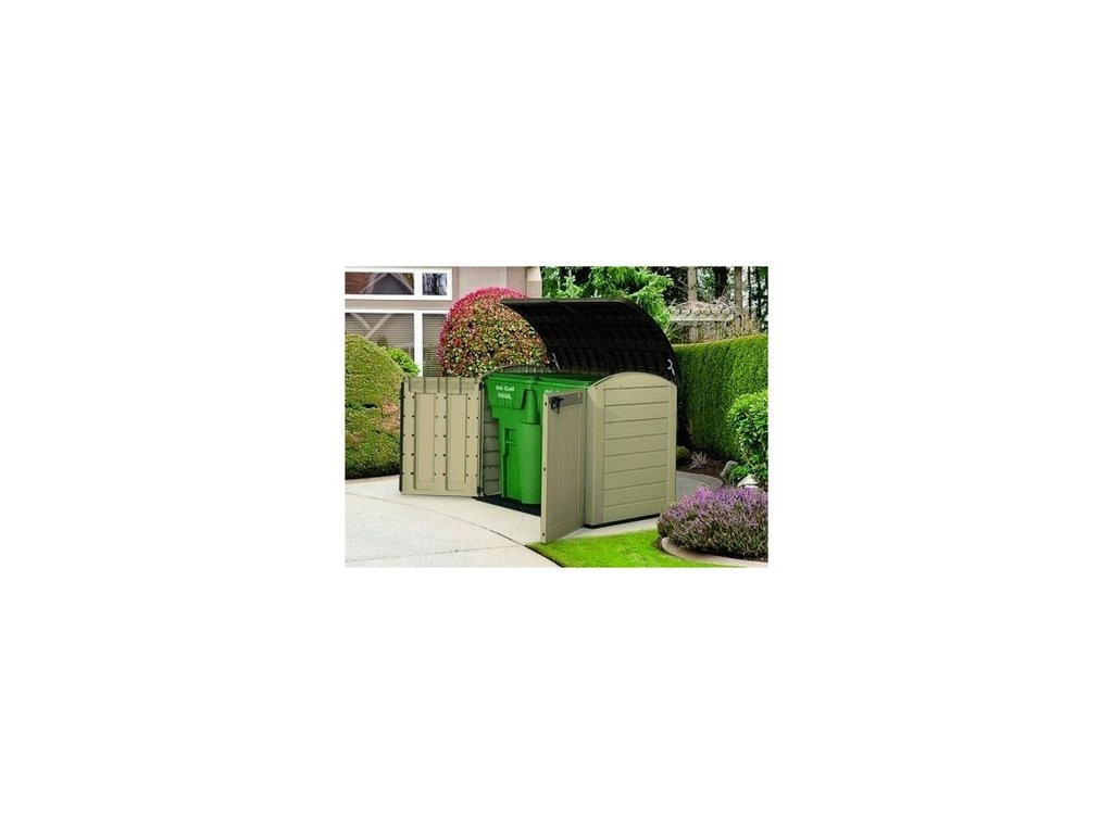 Široké 2-krídlové dvere sú uzamykateľné zhora pomocou skrutky a zdola pomocou zámku. Používatelia, ktorí žijú v rušných štvrtiach, môžu obsah prístrešku zabezpečiť prídavným visiacim zámkom, čím sa zníži riziko krádeže koša alebo iného príslušenstva. Prístrešok je vyrobený z vysokokvalitnej polypropylénovej živice v modernom dizajne, ktorý imituje štruktúru prírodného ratanu. Steny sú vystužené rebrovými segmentmi, ktoré odolávajú hrubému zaobchádzaniu, vandalizmu, extrémnemu počasiu a UV žiareniu.