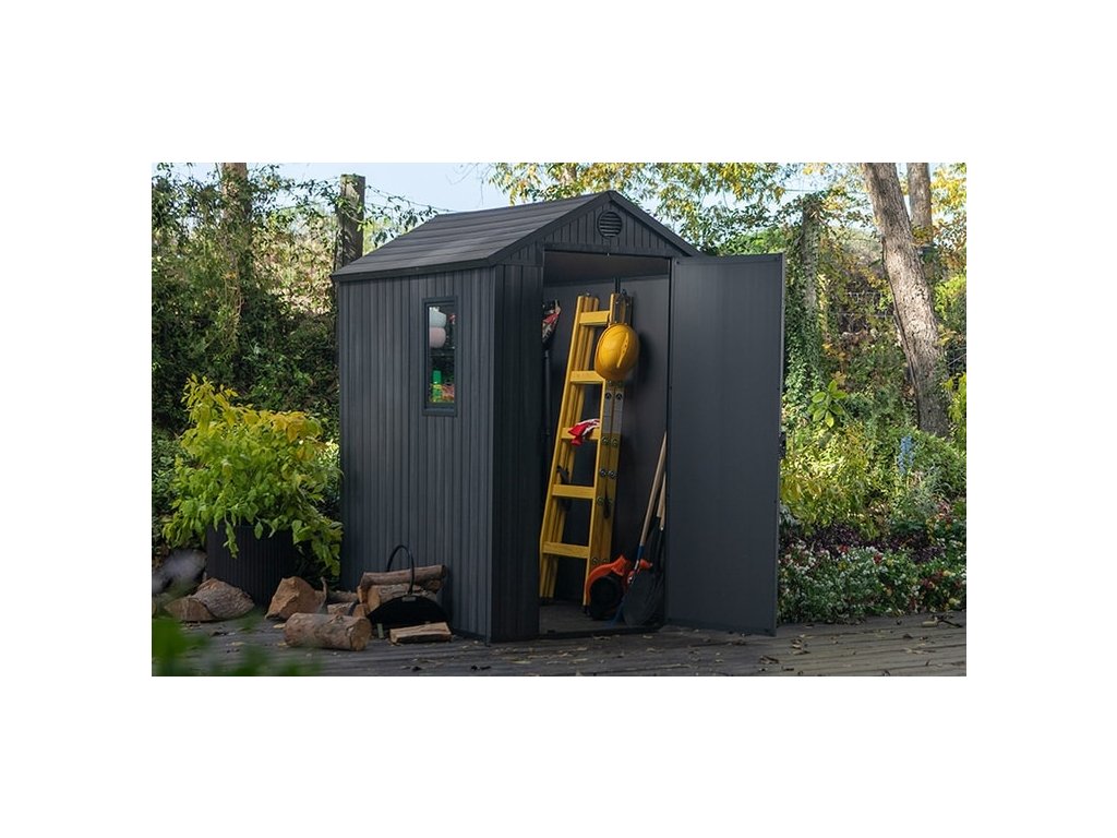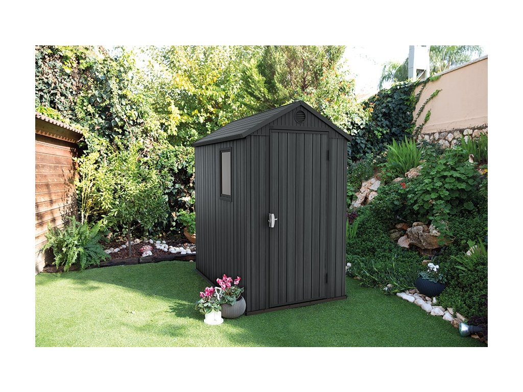 Tento záhradný domček je nenáročný na údržbu, nemusí byť vôbec impregnovaný a čistenie a montáž sú veľmi jednoduché. Domček KETER Darwin má tiež odolný podlahový panel a silnú sedlovú strechu, zaťaženie je rovnomerne rozložené a všetky upevnenia v celej konštrukcii sú extrémne tesné a stabilné. Okrem toho je domček Keter Darwin 4x6 vybavený pevnými dverami s efektívnym zatváraním a veľkým oknom, ktoré umožňuje preniknúť slnečnému žiareniu. Výrobca sa tiež postaral o vhodný ventilačný systém s regulovanou cirkuláciou vzduchu. Môžete si byť istí, že predmety uložené vnútri budú dobre chránené a záhradný domček Keter Darwin 4x6 je vhodný na skladovanie nielen záhradného náradia ale aj športového náčinia, vybavenie pre dielne atď.