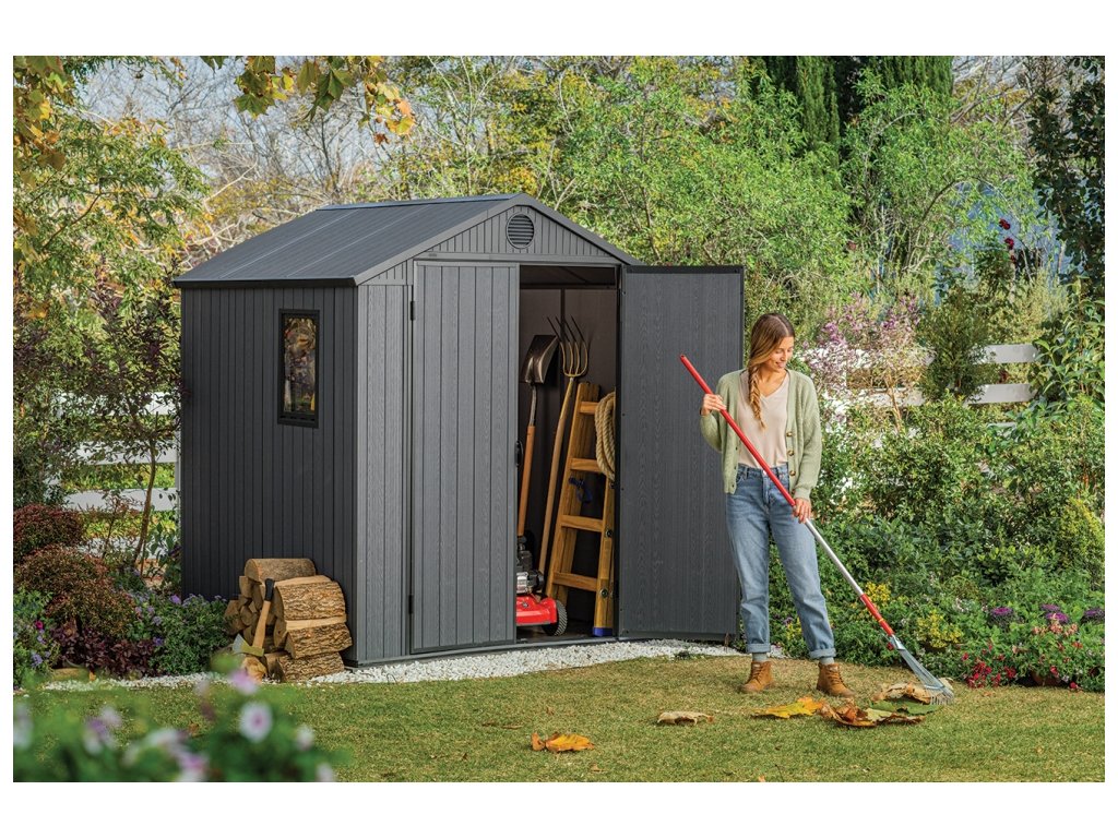 Tento záhradný domček je nenáročný na údržbu, vôbec ho netreba impregnovať a jeho čistenie a montáž sú veľmi jednoduché. Keter Darwin má tiež odolný podlahový panel a pevnú sedlovú strechu, zaťaženie je rovnomerne rozložené a všetky upevnenia v celej konštrukcii sú mimoriadne pevné a stabilné. Okrem toho je Keter Darwin 6x6 vybavený pevnými dverami s účinným zatváraním a veľkým oknom, ktoré umožňuje prenikanie slnečného svetla. Výrobca zabezpečil aj vhodný ventilačný systém s riadenou cirkuláciou vzduchu. Môžete si byť istí, že predmety uložené vo vnútri budú dobre chránené a záhradný domček Keter Darwin 6x6 je vhodný na uskladnenie nielen záhradného náradia, ale aj športového náčinia, dielenského vybavenia atď.