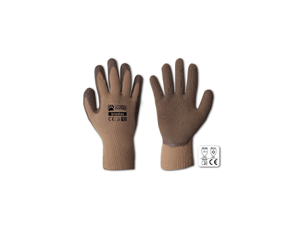 Zateplené pracovné rukavice BRADAS Grizzly z bavlneného úpletu. Potiahnuté penovou vrstvou latexu s hrubou štruktúrou.