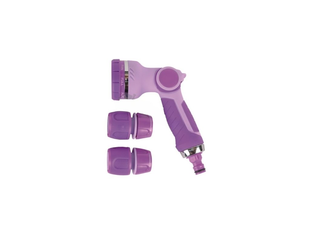 Záhradný zavlažovací komplet je vyrobený v pastelových farbách odtieňov fialovej.Kvalitná zavlažovacia pištoľ s 8 funkciami zalievania je doplnená 2 ks rýchlospojok pre pripojenie k záhradnej hadici 1/2"